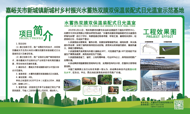 嘉峪關市新城鎮新城村鄉村振興水蓄熱雙膜雙保溫裝配式日光溫室示范基地水蓄熱雙膜雙保溫裝配式日光溫室是由內蒙古農業大學與內蒙古中天科技有限公司聯合研發完成,并已在東北、西北、華北等地區進行了大面積的示范推廣。該溫室集成了10多項專利技術,實現了北方寒冷地區冬季不加熱正常生產果菜類蔬菜,對于促進設施蔬菜產業發展及帶動當地農民增收致富有著非常重要的意義,該溫室具備以下特點: