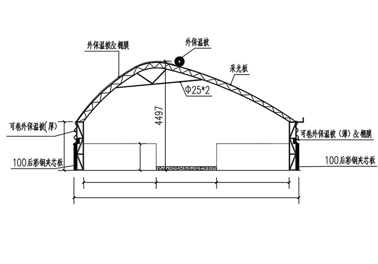 1. 該棚舍由全鋼骨架、雙膜單被、護欄等裝配而成,結構輕便,采光角度合理,實現了通風和卷簾的自動控制。具有采光和保溫性能好、承載力強等特點。